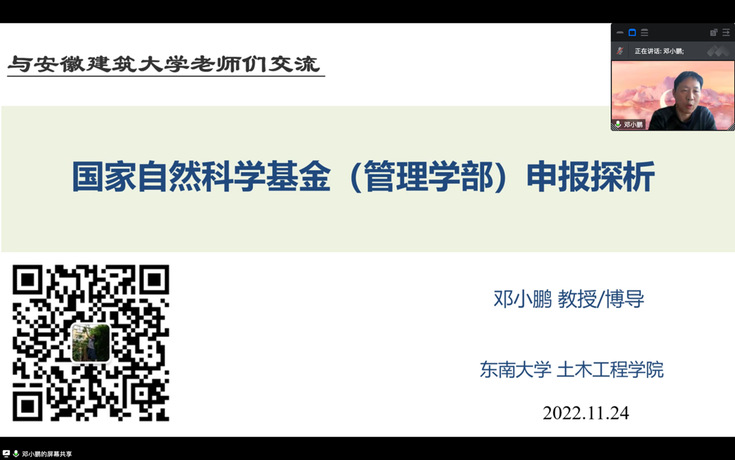 本网讯 11月24日,东南大学博士生导师、经管学院特聘教授邓小鹏应邀为经管学院教师作题为“国家自然科学基金(管理学部)申报探析”的专题辅导,院内外教师共三十余人参加,会议由副院长章蓓蓓主持。