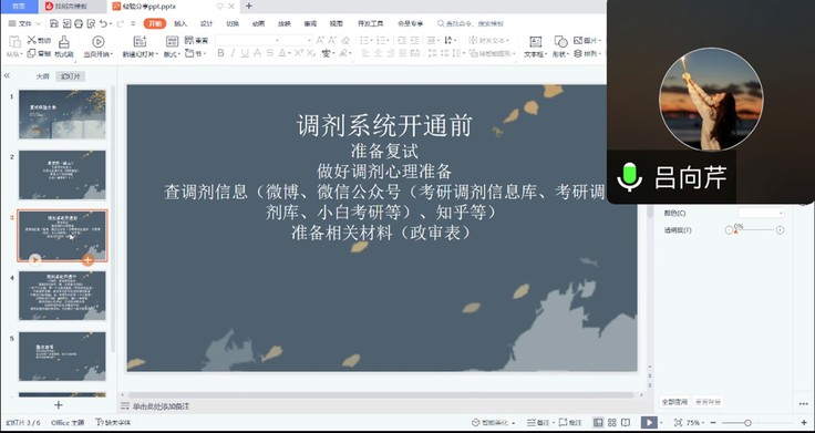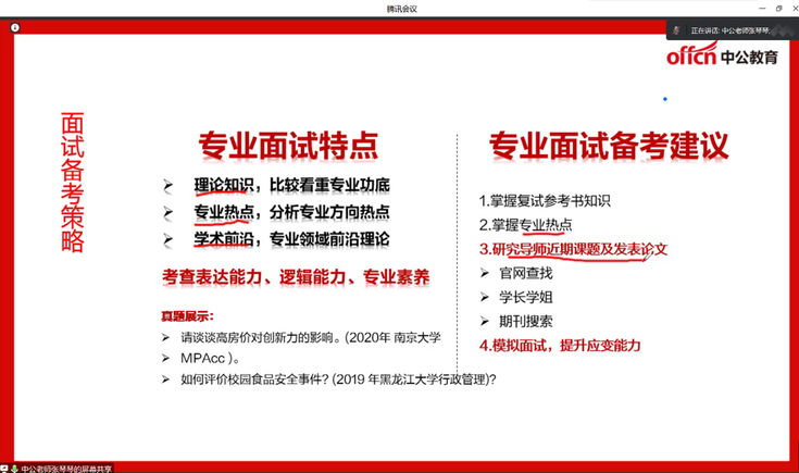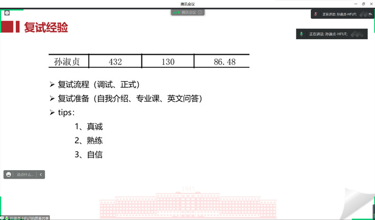 会上,中公考研资深经济学讲师张琴琴结合多年考研指导工作经验,以生动具体案例和详细图表,围绕研究生复试准备、复试注意事项、调剂方法流程等内容进行了全面细致解读。学院2022届毕业生、合肥工业大学研究生孙淑贞分享了线上复试的流程及注意事项,分析了复试各个环节需要关注的细节,强调在复试过程中要结合自身实际,向导师展示自己的专业特长。2022届毕业生、上海师范大学研究生吕向芹结合自身调剂的经验,强调了调整心态的重要性,她鼓励初试不理想的同学要做好充分准备,密切关注调剂信息,积极主动联系调剂学校,把握机会顺利“上岸”。三位分享嘉宾也围绕同学们关心的问题做了详细解答,讲座气氛热烈。