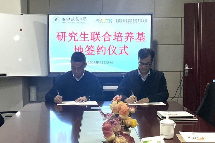 本网讯 为深化校企合作,充分发挥产学研协同育人作用,开拓毕业生高质量就业渠道,2月28日下午,经管学院党政负责人带队赴安徽欧泰克建筑节能有限公司进行走访调研,就人才需求、行业发展、研究生联合培养等进行深入交流研讨,并举行了签约与挂牌仪式。安徽欧泰克建筑节能有限公司董事长刘必武以及相关部门负责人参加了洽谈交流。