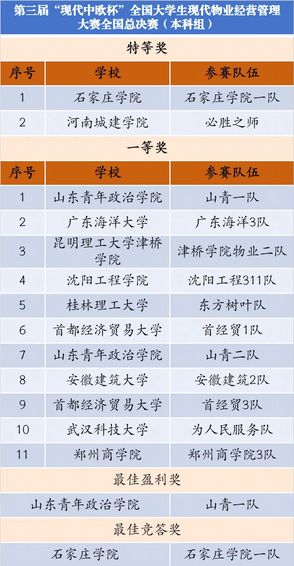 本次比赛通过物业经营模拟训练系统平台,以竞争性模拟经营的形式开展,主要是为了锻炼学生的物业经营管理素质。比赛分为竞争性模拟经营和理论知识测试两个环节。经过前期选拔,武汉科技大学、首都经济贸易大学、南宁师范大学等50所院校109支队伍300多名选手成功晋级全国总决赛。经过激烈角逐,桂勇杰、方旭、盛宇凡等九位同学组建的三支团队,在总决赛中获得一等奖1项、二等奖2项,充分展示了学校学子的优秀团队协作能力和经营管理能力,也展示了扎实的专业理论基础,赛出了风采。
