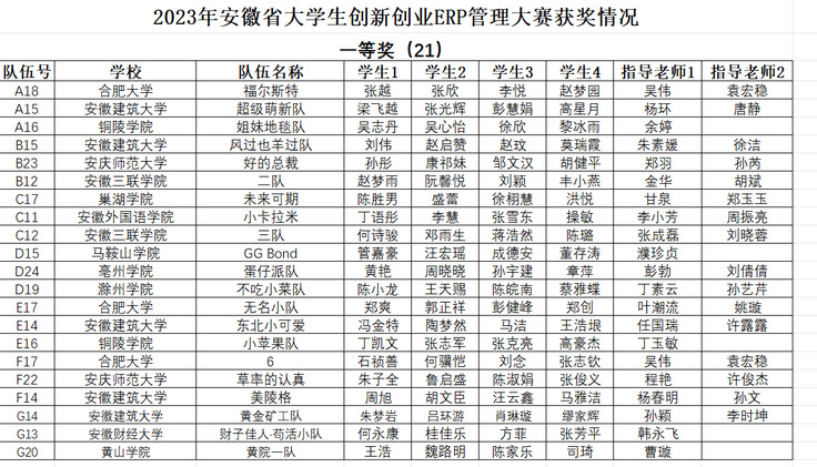 本网讯 12月23日,由安徽省教育厅主办、合肥大学承办的2023年安徽省大学生创新创业ERP管理大赛顺利落下帷幕。经管学院由刘伟、赵启赞、周旭、陶梦然、朱梦岩、梁飞越等同学组成的5支代表队,与来自合肥工业大学、安徽农业大学、安徽财经大学、安徽理工大学等在内的36所省内本科高校的166只队伍、近800名学生同台竞争,以优异的成绩斩获全部21个省级一等奖中的5个一等奖,并成功晋级国赛,获奖数量和质量再上新台阶。