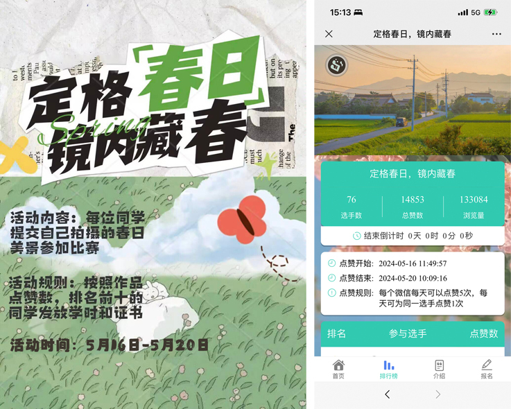 此次大赛采用线上投票和线下评审相结合的形式,活动报名人数达70余人,累计访问人次超130000次,累计点赞量超14000次。参赛作品主要围绕春天、希望、梦想、幸福等主题,包含人物、动植物、校园风景等内容,充分展现了同学们热爱生活、热爱校园、热爱生命的精神风貌。