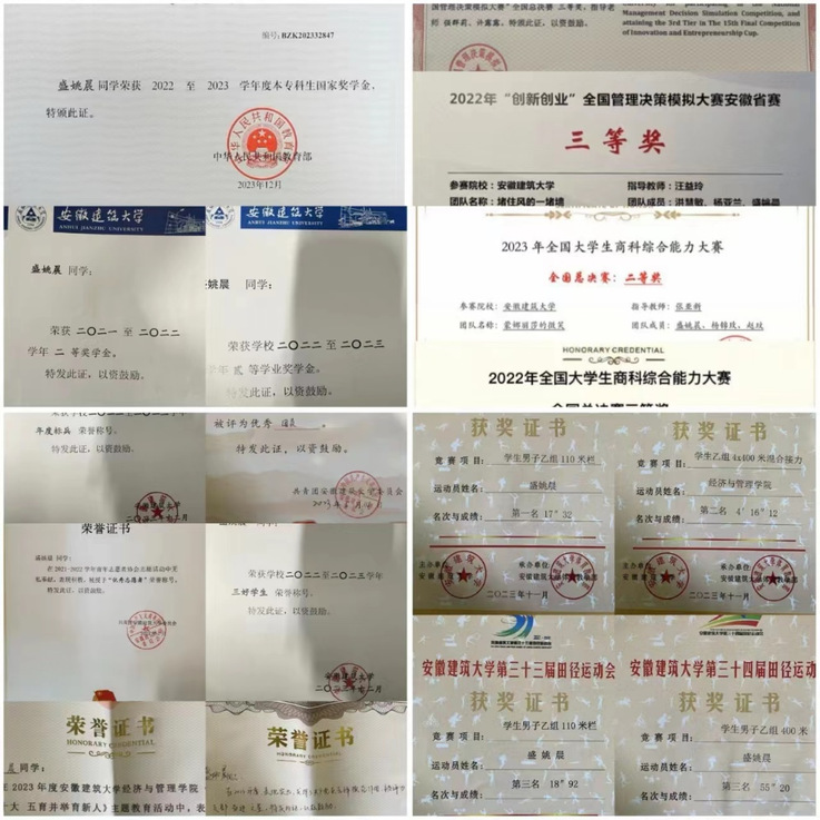 盛姚晨认为心有所信,方能行远。制定目标可以让自己更有动力、更有方向地努力前行。大一开始,他就积极向党组织靠拢、努力提高自己的专业能力。经过三年的奋斗,盛姚晨于2023年成为一名光荣的中共预备党员。他两年的学分绩点和综合绩点均位列专业第一,连续获得校一等奖学金,2023年度更是获得国家奖学金,荣获全国大学生商科综合能力大赛二等奖和三等奖、全国大学生商科综合能力大赛三等奖、第十五届“创新创业”全国管理决策模拟大赛三等奖以及若干省级、校级奖项。如今大三的他,新阶段的规划是考研上岸,继续深造。他坚信:只要用心对待,努力去做,坚持到底,一定有所收获,实现自己的梦想。