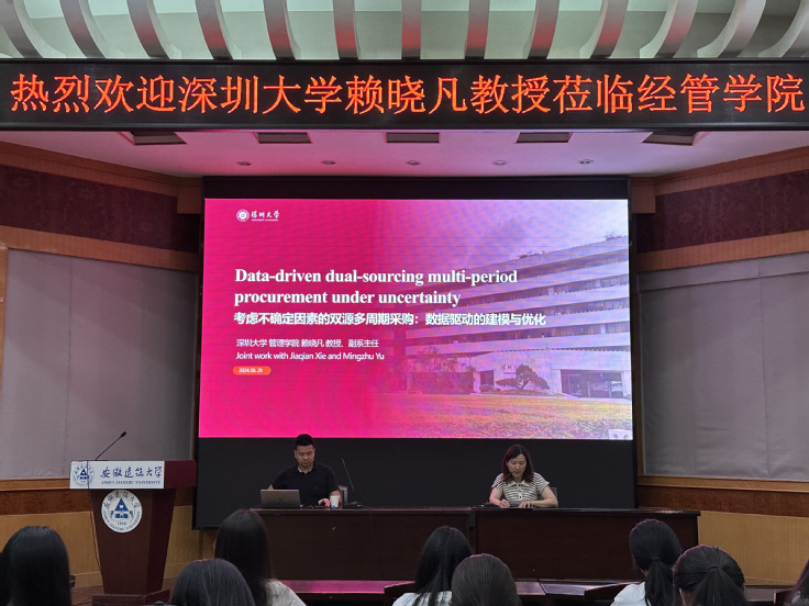 本网讯 6月28日,深圳大学管理学院赖晓凡教授应邀到经管学院举办题为“考虑不确定因素的双源多周期采购:数据驱动的建模与优化”的学术讲座。讲座由经管学院副院长章蓓蓓主持,学院教师、硕士研究生共80余人参加。