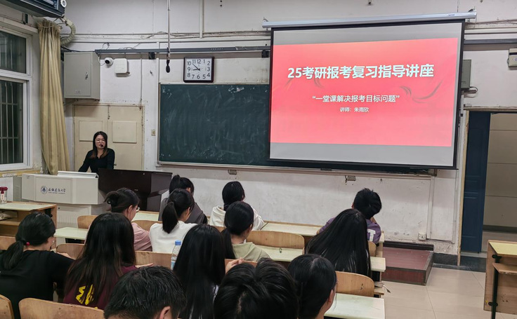 本网讯 为助力即将踏上考研征途的2025届学子们,帮助他们明确方向、坚定信心、科学备考,经管学院于9月25日举办考研报考复习指导讲座。讲座邀请了中公考研安徽研究院院长朱雨欣老师作为主讲嘉宾,她以其丰富的考研指导经验和深厚的专业知识,为现场近150名考研学子带来了一场精彩纷呈的分享。