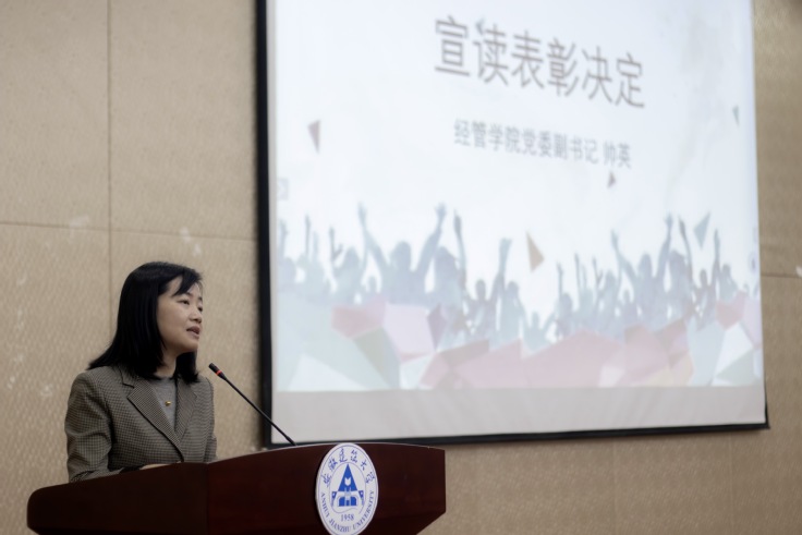 学院党委副书记帅英宣读表彰决定。授予盛姚晨、杨孝莉等25位同学优秀运动员荣誉称号、授予王子墨等14位同学优秀志愿者荣誉称号、授予王蕻研等4名同学突出贡献者荣誉称号。帅英表示,本次运动会优异成绩的取得,彰显了经管学子优秀的精神风貌,增强了团队意识,传承了体育精神,提升了竞技水平,收获了成长的喜悦。希望受到表彰的同学再接再厉,将赛场上那股不服输、敢拼搏的劲头延续到日常的学习与生活当中去,享受过程并收获快乐。