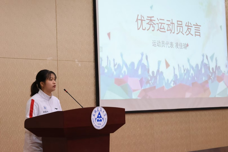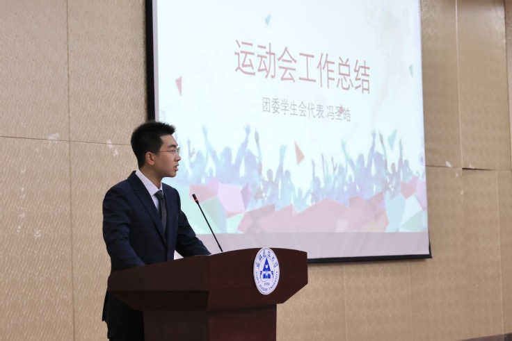 会上,团委学生会代表冯圣浩对运动会前期宣传、运动员选拔及训练、方阵训练、后勤保障等方面进行总结汇报。他表示,学院的每一次进步都离不开运动员们坚韧不拔、志愿者们无私奉献的精神力量传承。这种精神力量的传承,不仅推动着我们在运动会上不断突破,更在平日的学习和生活中激励着我们不断前行,希望能够在今后的校运动会中再接再厉,创造更加辉煌的成绩!女子100m栏冠军、4×400m冠军,2022级财务管理专业凌佳瑜同学代表优秀运动员发表个人感言,她表示,运动场上每一个名次的取得,都是大家挥洒汗水,奋勇拼搏的结果,每一个奋不顾身勇往直前的身影都彰显了学院锐意进取、昂扬向上的精神风貌,希望大家都能锐意进取,继续发扬学院团结拼搏,奋发向上的优良传统。