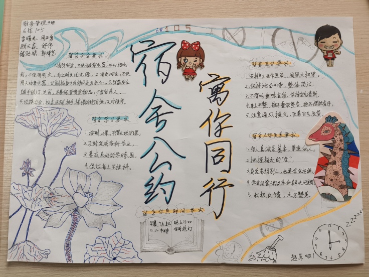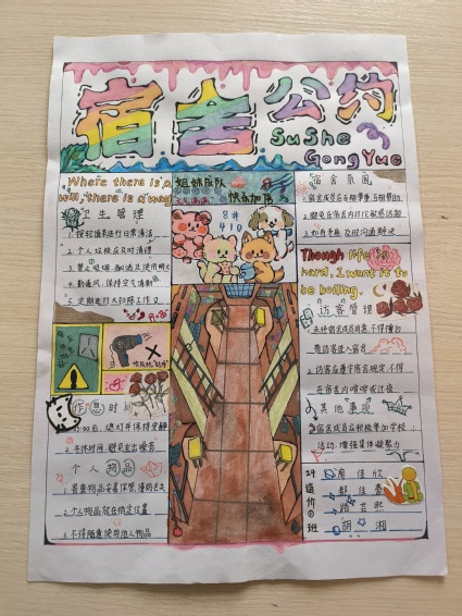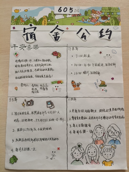 寝室成员根据公约要求,精心制作了各式海报。有的以深邃的星空为背景,星星闪烁,营造出梦幻而温馨的氛围;有的则是全手绘的海报,画中可爱的卡通人物形象色彩鲜艳,洋溢着青春活力;还有的采用极简风格,清新大方,给人一目了然的感觉。丰富多彩的海报内容不仅展示了同学们的创新思维与艺术才华,更体现出寝室成员们在共同维护宿舍和谐氛围中所付出的努力。