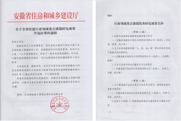 本网讯 近日,安徽省住房和城乡建设厅发布全省住建行业领域重点课题研究成果评选结果,我院教师刘艳、章蓓蓓执笔的研究报告《加快推进我省构建房地产新发展模式的对策研究》和《发展住房城乡建设领域新质生产力的路径研究》分获二等奖、三等奖。研究成果得到了安徽省住房城乡建设厅认可,并被通报表扬。