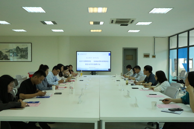 主题宣讲的同时,安徽省招投标采购协会秘书长胡美玲携安徽广电项目管理有限公司等8家企业负责人,在建树楼F525校友之家活动室开展校企合作交流研讨会,学院党委书记陈国中主持会议,并与用人单位亲切交流,全体毕业班辅导员参加座谈。