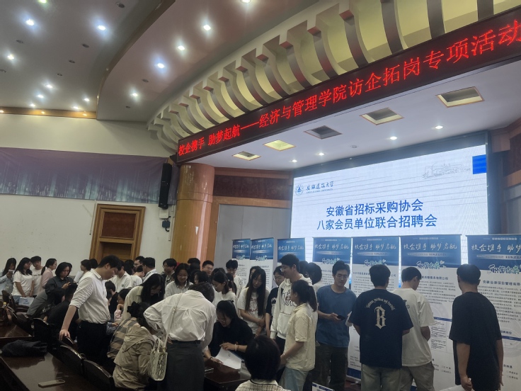 本网讯 4月11日,经管学院诚邀安徽省招标采购协会携8家优质企业来院举办“校企携手助梦启航”访企拓岗专项活动,通过职业规划主题宣讲、校企合作交流研讨、校园专场招聘会等多元形式,搭建高校、行业、企业三方育人平台,促进2025届经管类毕业生高质量充分就业。
