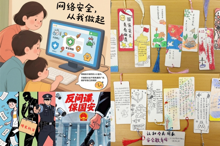 成果巩固环节则基于易班工作平台,开展了“听词绘图”“创意书签”“漫画创作”三项活动,进一步提升同学们的参与度与关注度。“听词绘图”活动中,同学们根据随机播放的国家安全关键词,在画纸上尽情发挥想象,结合自身理解,对其进行生动诠释;完成绘画后,大家依次分享创作思路,如用盾牌与锁的图案表示“信息安全”,用紧握的手象征“团结御敌”等。“创意书签”活动中,同学们在书签上写下自己的寄语,展现自己守护国家安全的坚定信念。“漫画创作”以AI辅助模式开展,鼓励同学们将前期学习成果转化为多彩漫画,将抽象的国家安全概念转化为直观的视觉表达,提升了国家安全教育活动的实效性。
