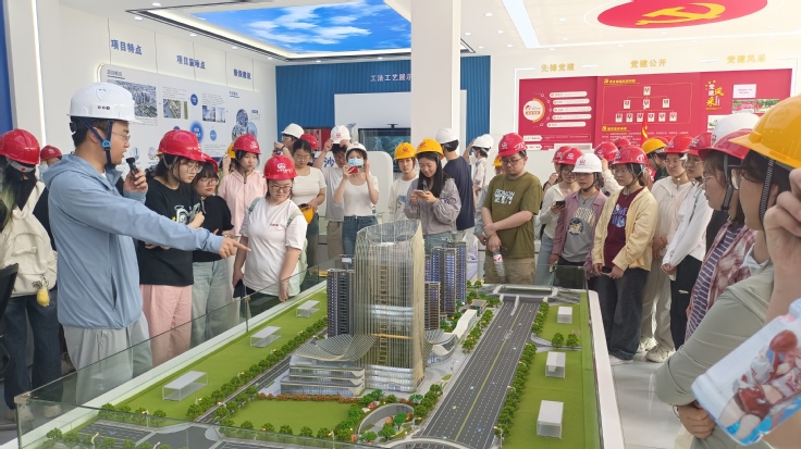 实习期间,同学们深入施工现场,在项目负责人带领下,详细了解项目的TOD模式运营实践。该项目以地铁6号线、8号线徽州大道换乘站为中心,在半径400-800米范围内构建高强度混合功能区,实现公共交通与城市生活深度融合,对缓解交通拥堵和减少环境污染起到积极作用。同学们还现场感受了智能建造成果,智慧工地平台运用BIM + GIS数字孪生技术,集成七大模块实现施工全周期数字化管理;附着式脚手架电子巡更系统、模块化楼梯操作平台等绿色施工技术专利工装,既保障安全又提升施工效率;装配式建筑高层住宅装配率达30%,采用预制楼梯等工艺减少现场作业,保障质量与工期。同学们还积极参与了项目的功能规划与民生配套建设的研讨。