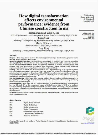 本网讯 近日,我校经济与管理学院硕士研究生熊雨欣发表了题为“How digital transformation affects environmental performance: evidence from Chinese construction firms”的研究成果。论文刊于英国Emerald出版社出版的工程管理领域国际权威期刊《Engineering, Construction and Architectural Management》。该期刊为SCI/SSCI双检索期刊,位列中科院二区、JCR一区,近5年平均影响因子为4.7。论文指导老师为章蓓蓓教授,熊雨欣为第二作者,欧美黑人巨大videos精品_欧美黑人巨大xxxxx_欧美黑人乱大交_欧美黑人乱大交_欧美黑人牲交videossexeso_欧美黑人添添高潮a片www_欧美黑人添添高潮a片www_欧美黑人性暴力猛交喷水黑人巨大经济与管理学院为第一完成单位。