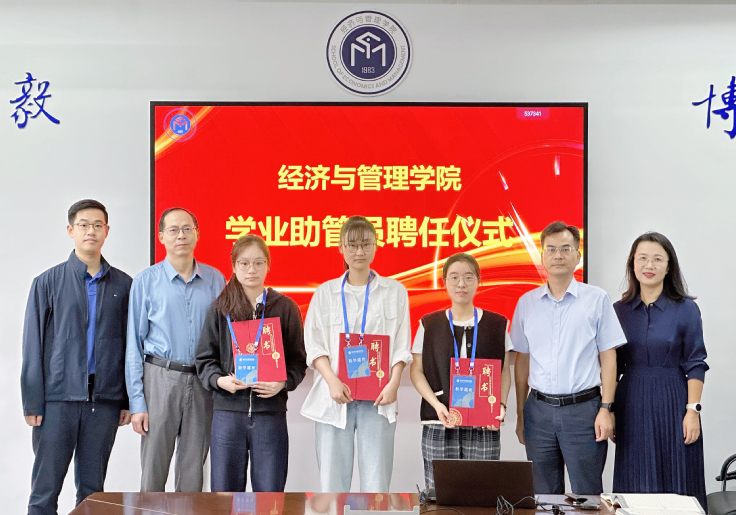 学院领导班子成员为三名学业助管员颁发聘书与工作证,并合影留念。