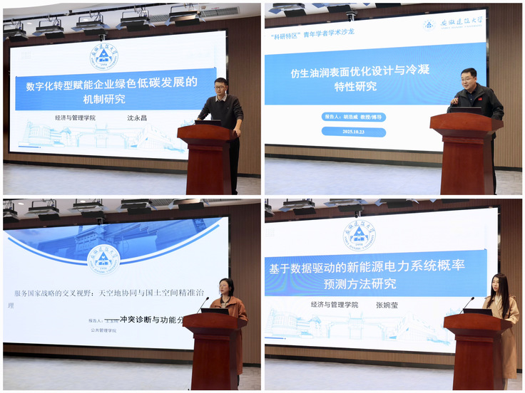 在报告交流环节,四位来自不同学院的青年学者围绕数字化与绿色发展主题分享了最新研究成果。经济与管理学院沈永昌博士作了《数字化转型赋能企业绿色低碳发展的机制研究》报告,解析数字化转型如何支持企业绿色低碳实践及二者关联的内在运作逻辑;环境与能源工程学院胡浩威教授分享了《仿生油润表面优化设计与冷凝特性研究》,展示仿生油润表面的优化设计方法及对其冷凝特性的相关研究成果;公共管理学院王玉纯博士以《服务国家战略的交叉视野:天空地协同与国土空间精准治理》为题,从交叉视角探讨 “天空地协同” 技术如何助力国土空间精准治理,以服务国家相关战略需求;经济与管理学院张婉莹博士以《基于数据驱动的新能源电力系统概率预测方法研究》为题,分享了以数据驱动为核心的新能源电力系统概率预测相关研究及方法探索。他们的分享不仅为在场听众带来了学术研究的新视角与新方法,也为相关领域的实践应用与未来发展提供了有益参考。