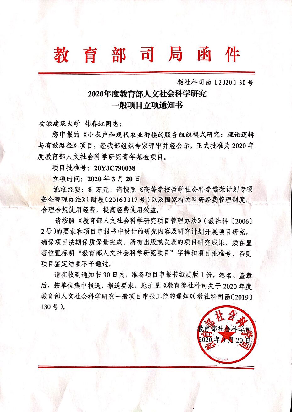 | 20YJC790038  | 小农户和现代农业衔接的服务组织模式研究:理论逻辑与有效路径  | 韩春虹  | 8  |