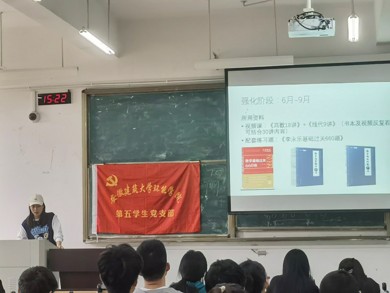 本次活动邀请了9名学生党员代表参与分享,周晓雨同学今年成功被合肥工业大学录取,她从备考经验展开讲述,强调了如何备考数学,耐心讲解了数学学习的重要时间节点,并向与会同学推荐了相关数学备考资料;程达慢同学考入南京理工大学环境工程专业,她结合自身考研经历,从科目安排、复习准备、心态调整等方面给出了合理化建议。