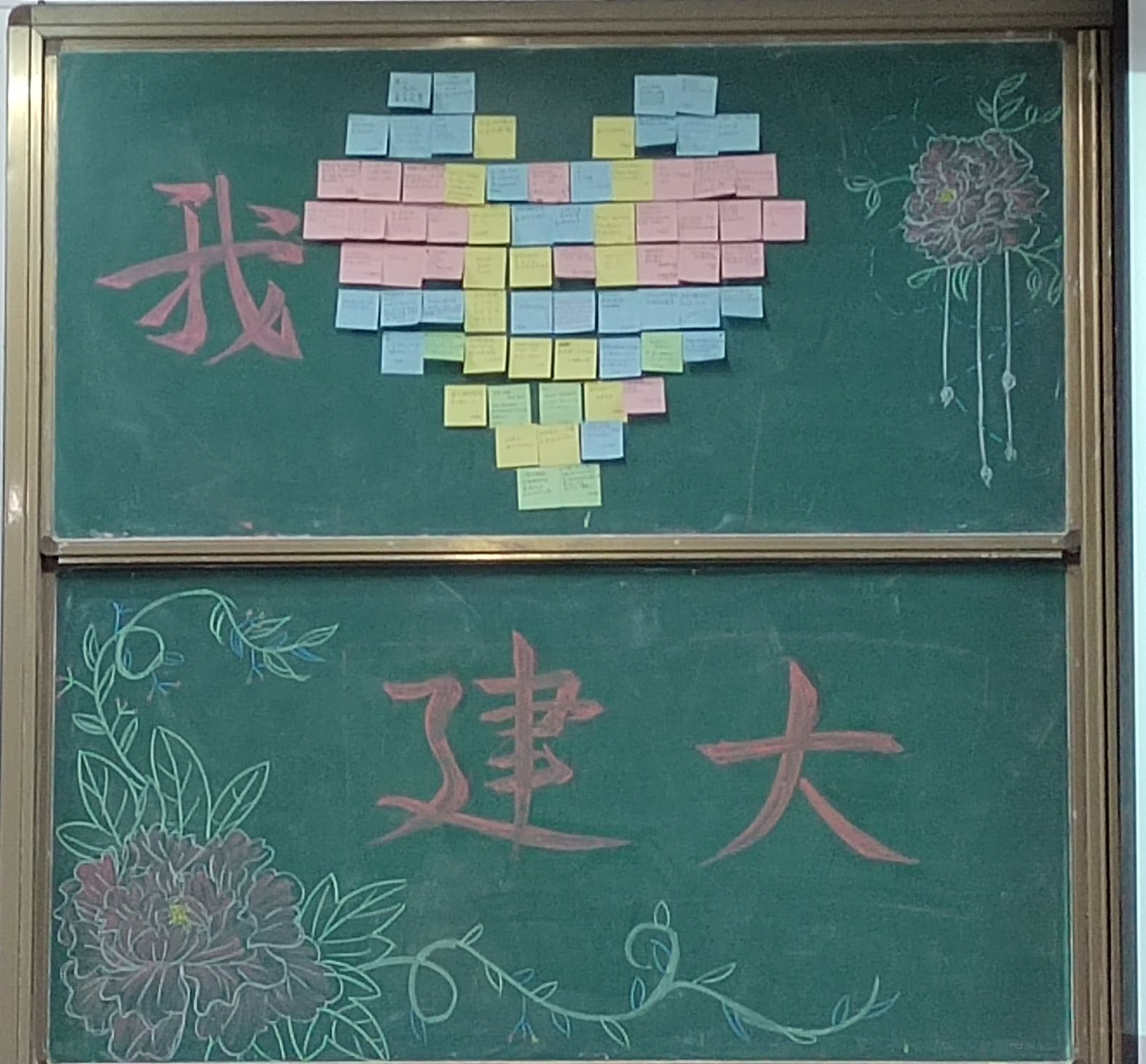 学院各班级召开主题团日活动,集中观看学校纪录片《腾飞》,感受学校波澜壮阔的60多年发展史,共同了解学习学校的建校史、更名史、发展史,畅谈学校发展的美好前景,并写下对学校的祝福,把写满祝福的卡片贴在黑板上构图“我爱建大”,表达对学校的热爱和美好的祝福。