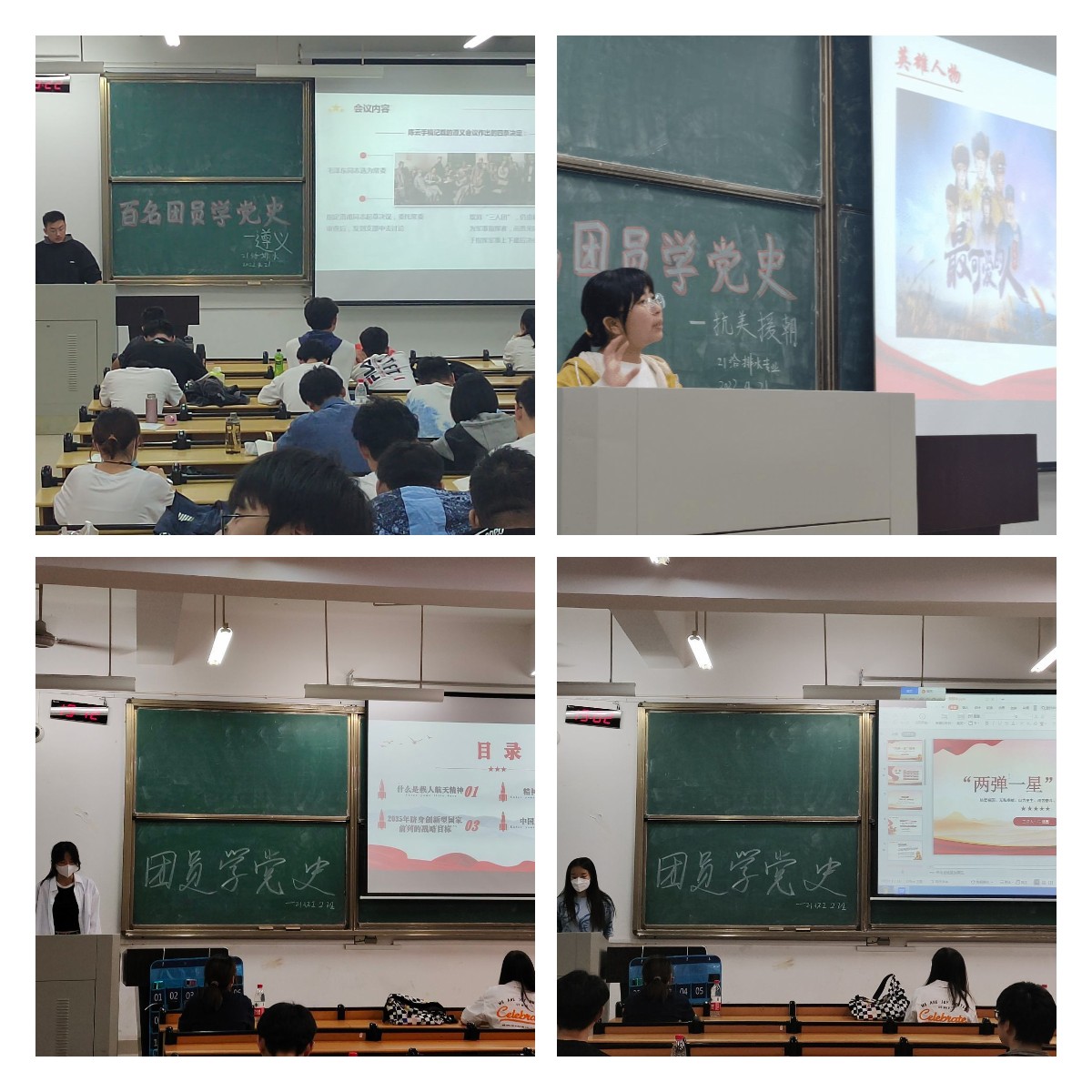 本期团日活动以马克思主义传入到现代化建设中党和国家发生的重大历史事件为讲述内容,主题词是:重要转折点。刘思雨同学从抗美援朝的现实意义以及关于抗美援朝的优秀纪录片和电影分享三个方面来讲述“抗美援朝精神”。曹汇川同学从遵义会议历史背景、会议内容、会议意义、会议精神四个方面介绍了遵义会议在极端危急的历史关头的重要意义。孙海洋同学以“壮阔东方潮奋进新时代”为主题讲述十一届三中全会重要内容和以邓小平为核心的党的第二代领导人开启进行改革开放的历史。牛佳鑫同学以邓稼先和钱学森的人物事迹作为导入讲述老一辈科学家在较短的时间内成功地研制出“两弹一星”的人间奇迹,让中国人民挺直腰杆站起来的“两弹一星”精神。大家表示通过政治学习,提高了认识,要立大志,争做民族复兴的栋梁,勇于当强国先锋。不负韶华,不负时代,继续在青春的赛道上奋力奔跑,争取跑出当代青年的最好成绩!
