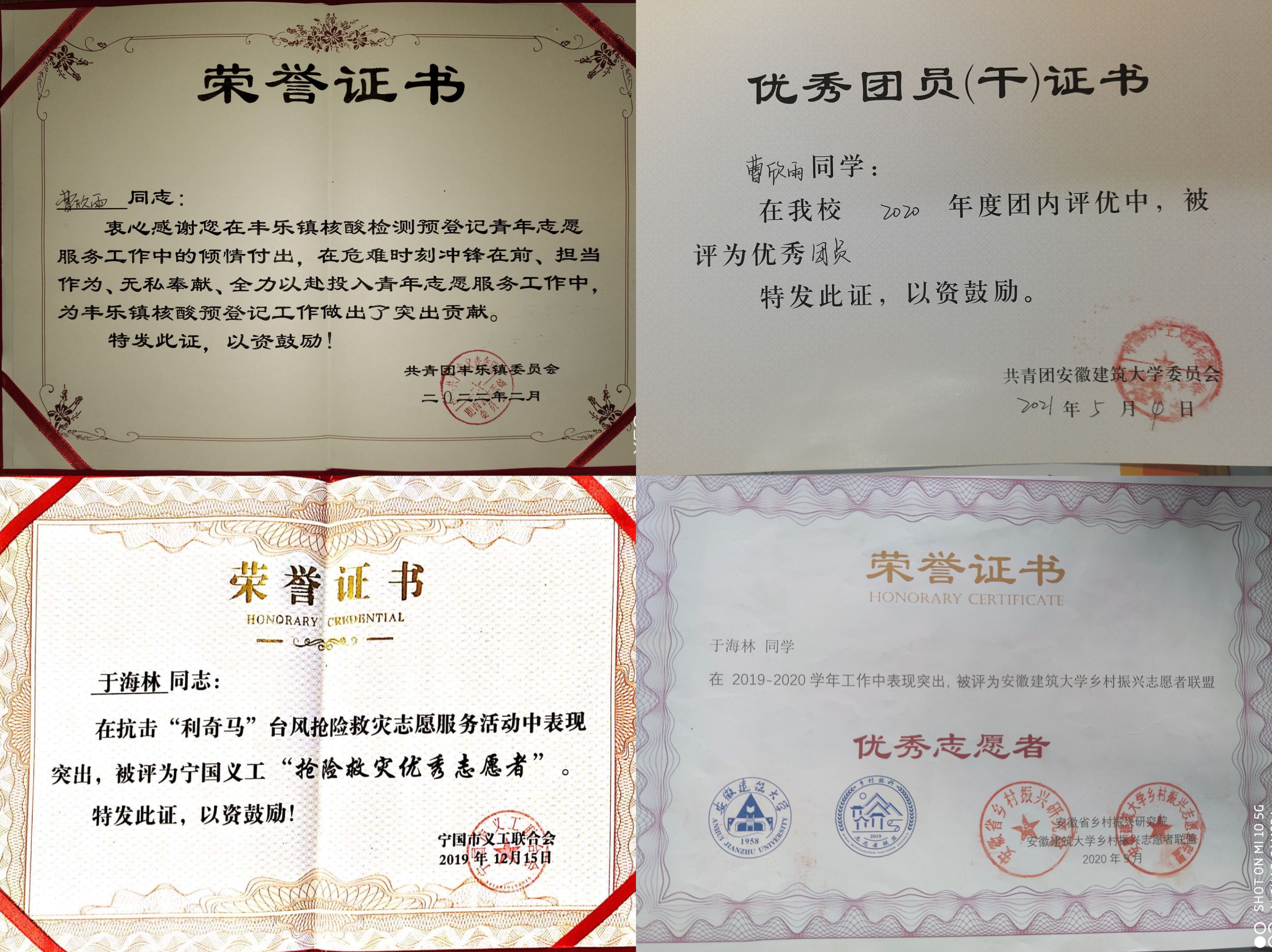 据了解,四名学生都十分热爱公益事业。今年年初,曹欣雨、于海林都是家乡的疫情防控志愿者,在村里帮助老人申领健康码,组织村民有序排队做核酸。本学期学校封闭式管理期间,四名都学都报名了食堂志愿者,为过往的同学们量体温,宣传防疫知识,维持食堂就餐秩序。朱思晨、李明月、于海林都曾在献血车进校园时献过血,李明月现在依然是流浪猫救助协会的会员。于海林是四名学生中的唯一男生,他从初中就开始做环卫工志愿者,“利奇马”台风席卷家乡宣城宁国时,他又挺身而出成为一名“抗洪志愿者”,他还加入了学校乡村振兴志愿者联盟,不定期去养老院照看老人。