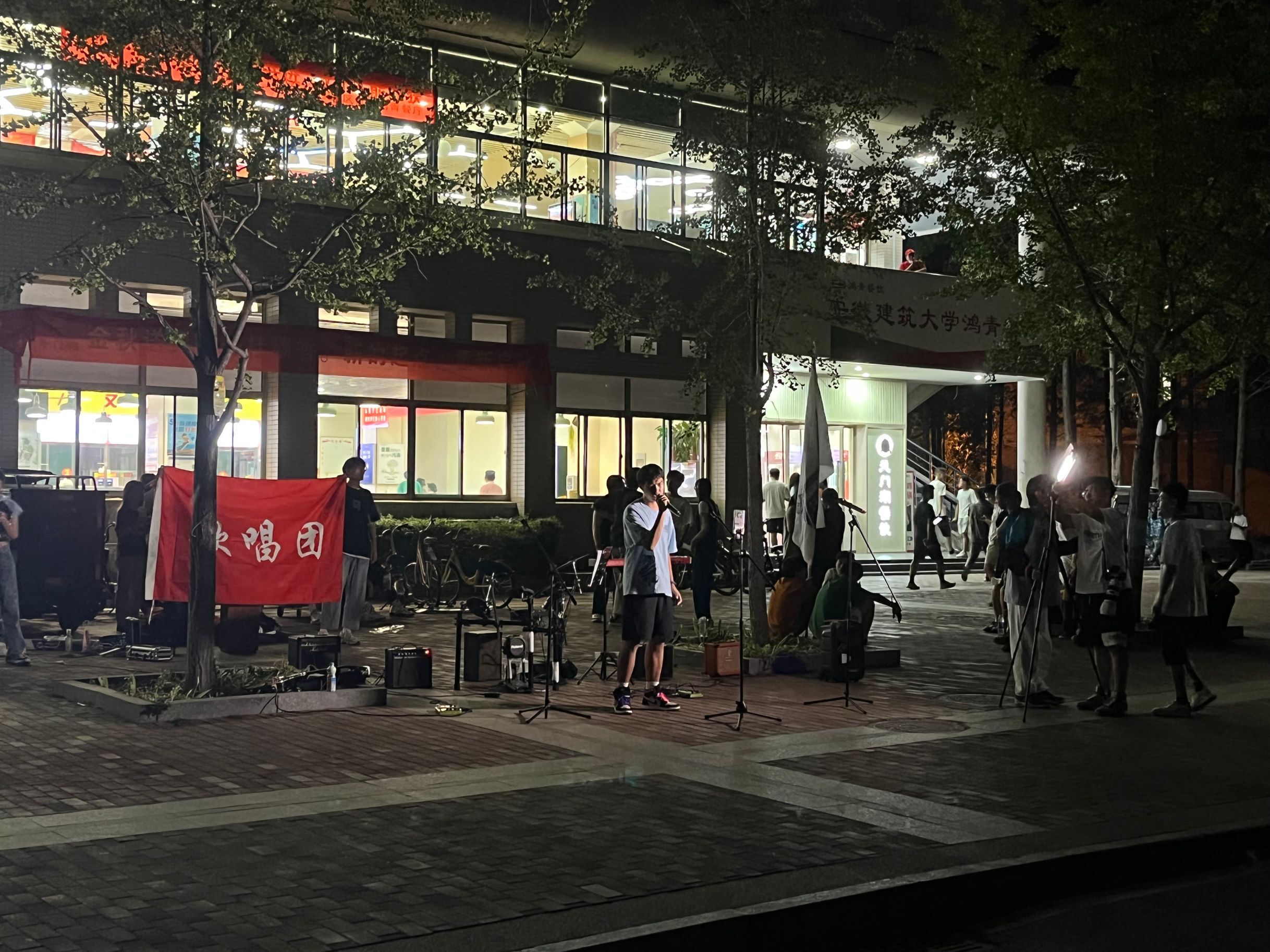 音乐响起,瞬间引爆全场,贝斯、吉他、架子鼓在乐手们的演奏下发出动人的旋律,歌手们带领观众激情合唱,音乐声、欢呼声响彻校园。《漫步》《西湖》《自由》等深受年轻人喜爱的曲目在乐队同学们的演绎下带来全新的感受,他们用自己的歌声,牵动着每一位观众的心。整场晚会,掌声阵阵,欢呼声不绝于耳,师生高举的荧光棒机在月色下跟随节奏舞动,整个场面热情洋溢。