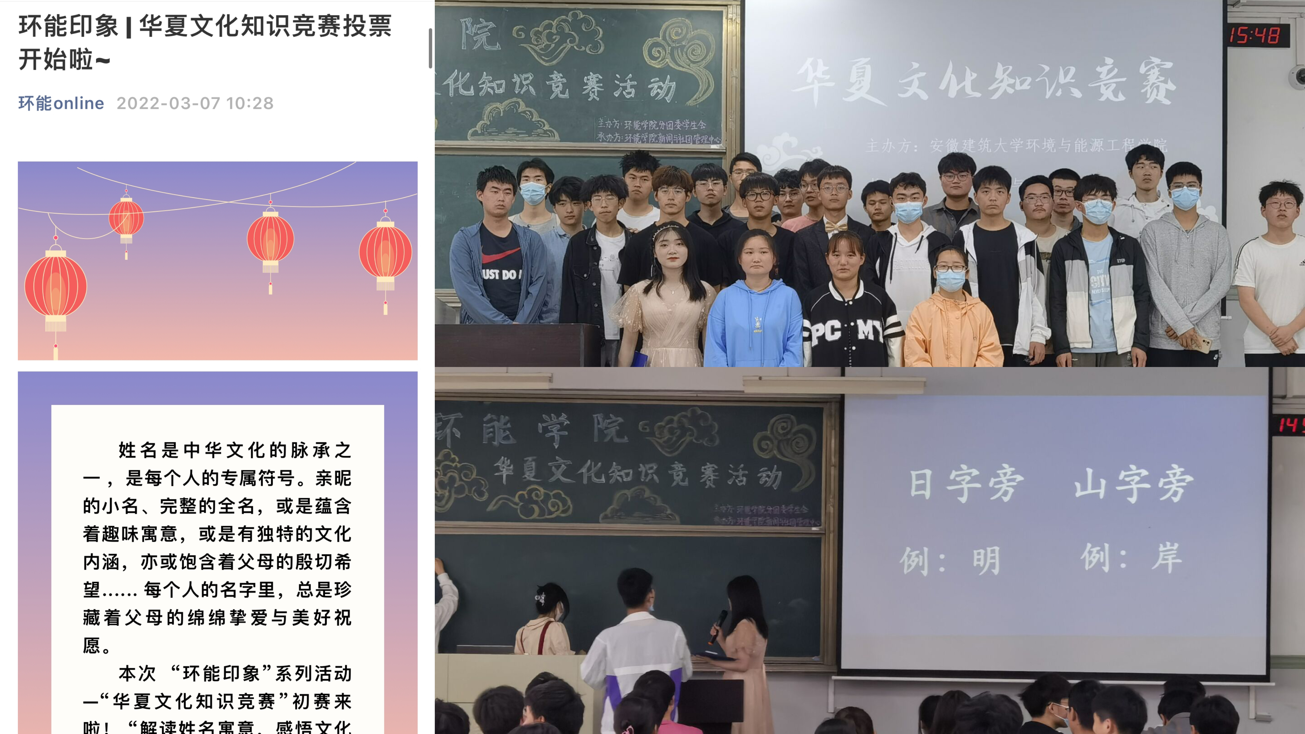 汉字是世界上历史最悠久的文字之一,是中华民族文化和智慧的结晶,是传承中华优秀传统文化的重要载体。3月初春时节,学院举办为期两周的华夏文化知识竞赛,带领同学们一起发掘汉字之美。初赛中,参赛选手对个人真实姓名进行深度解读,名字中或是蕴含着出生当天的节气,或是出自于某首诗词,亦或饱含着父母的殷切希望简单的名字深刻展现了汉字无与伦比的魅力决赛中,通过汉字专项、成语专项、诗词专项等关卡来考验同学们的知识积累灵活反应,选手们将浓厚的文学素养展现的淋漓尽致本次华夏知识竞赛展现了环能学子对国学精粹的炽热之心,也彰显了中华传统文化的经典魅力。