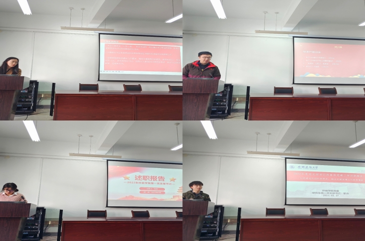 会上,学院教师和学生党支部书记分别进行述职汇报,聚焦学习宣传贯彻习近平新时代中国特色社会主义思想和党的二十大精神,落实党支部“七个有力”建设目标,提升党支部标准化规范化建设水平,加强思想政治理论学习、发挥党员示范引领作用、师德师风建设等方面,总结做法成效,分析问题原因,明确思路举措。