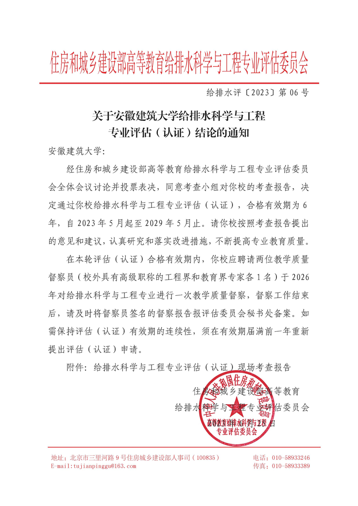 给排水科学与工程专业为首批国家级一流本科专业建设点,于2007年首次通过了全国高等学校给排水科学与工程专业评估,并分别于2012年、2017年通过复评,此次是第四次参加评估认证。通过参加专业评估(认证),使我专业人才培养目标和定位更加明确,课程体系进一步优化,师资队伍结构更加合理,人才培养质量不断提升,专业办学水平不断提高,社会影响力持续增强。