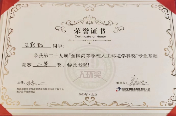 本网讯 8月25日,第29届“全国高等学校人工环境学科奖”专业基础竞赛(简称“人环奖”)颁奖典礼在清华同方科技广场举行。我校环境与能源工程学院建筑环境与能源应用工程专业三年级学生王蔚凯获得了本届竞赛的全国二等奖。