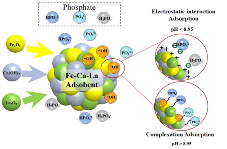大量未经处理的磷被释放到环境水体,严重影响了水生态系统的健康,造成水体富营养化。二元和三元金属氧化物体系因具有很好的物理和化学性质,被认为具有作为磷去除剂的潜力。本研究采用一种共沉淀法合成了一种低成本的三元铁-钙-镧(Fe-Ca-La)复合材料,并通过各种表征方法研究了Fe-Ca-La去除磷酸盐的性能和可能的吸附机理,并讨论了pH和其他环境相关阴离子对复合材料磷酸盐吸附能力的影响。