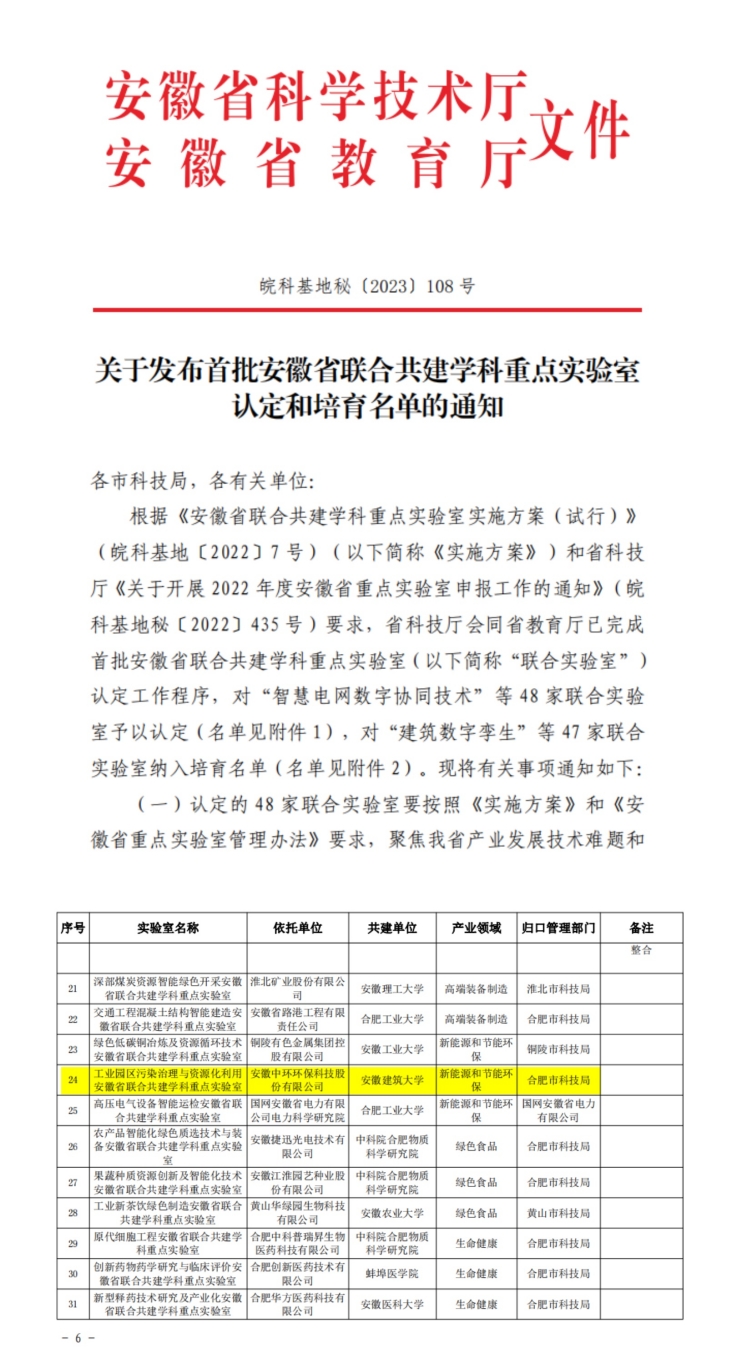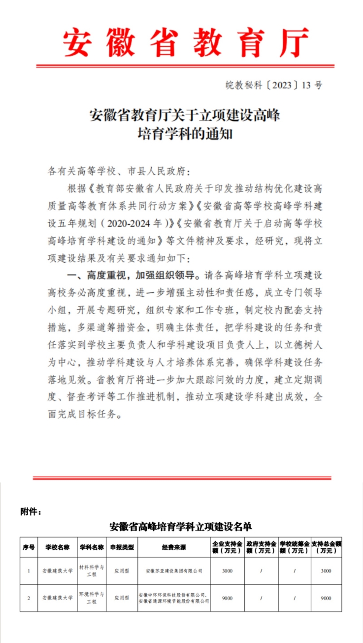 高峰学科建设不断取得新突破。学院紧扣安徽省十大新兴产业,加强统筹谋划和顶层设计,与安徽中环环保科技股份有限公司、安徽通源环境节能股份有限公司共同建设的环境科学与工程学科成功入选安徽省高峰培育学科建设名单,通过2022年绩效评价,结果优良。