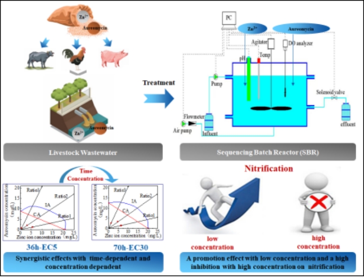 本网讯 序批式活性污泥法(SBR法)以其高效COD去除效果和同步脱氮除磷的特性,广泛应用于养殖废水的治理。然而,由于饲料添加剂的使用,养殖废水中含有大量的重金属和抗生素,这为SBR的生物脱氮过程带来不可控的风险。生物硝化阶段是生物脱氮过程中的关键阶段,该阶段的正常运行直接影响着生物脱氮的效果。但是重金属和抗生素对脱氮微生物的作用机理不同,二者共存时对硝化阶段的作用机制尚不清楚。针对该问题,环境与能源工程学院张华教授联合何春华博士以锌离子和金霉素为典型的重金属和抗生素,探究了该二元混合物对生物硝化阶段及其功能蛋白的影响。研究表明Zn2+和金霉素混合物对总氮去除率和硝化性能有明显的抑制效应,且该抑制效应归因于其对亚硝酸氧化酶活性的抑制。金霉素和Zn2+对硝化性能和亚硝酸氧化酶活性在整个浓度区内表现出强烈的浓度依赖性和时间依赖性的协同作用,且随着金霉素浓度比例的增加,混合物的协同作用会增强。因此,控制金霉素的浓度对SBR硝化过程至关重要。本研究为SBR法为畜禽废水脱氮处理提供了理论依据。