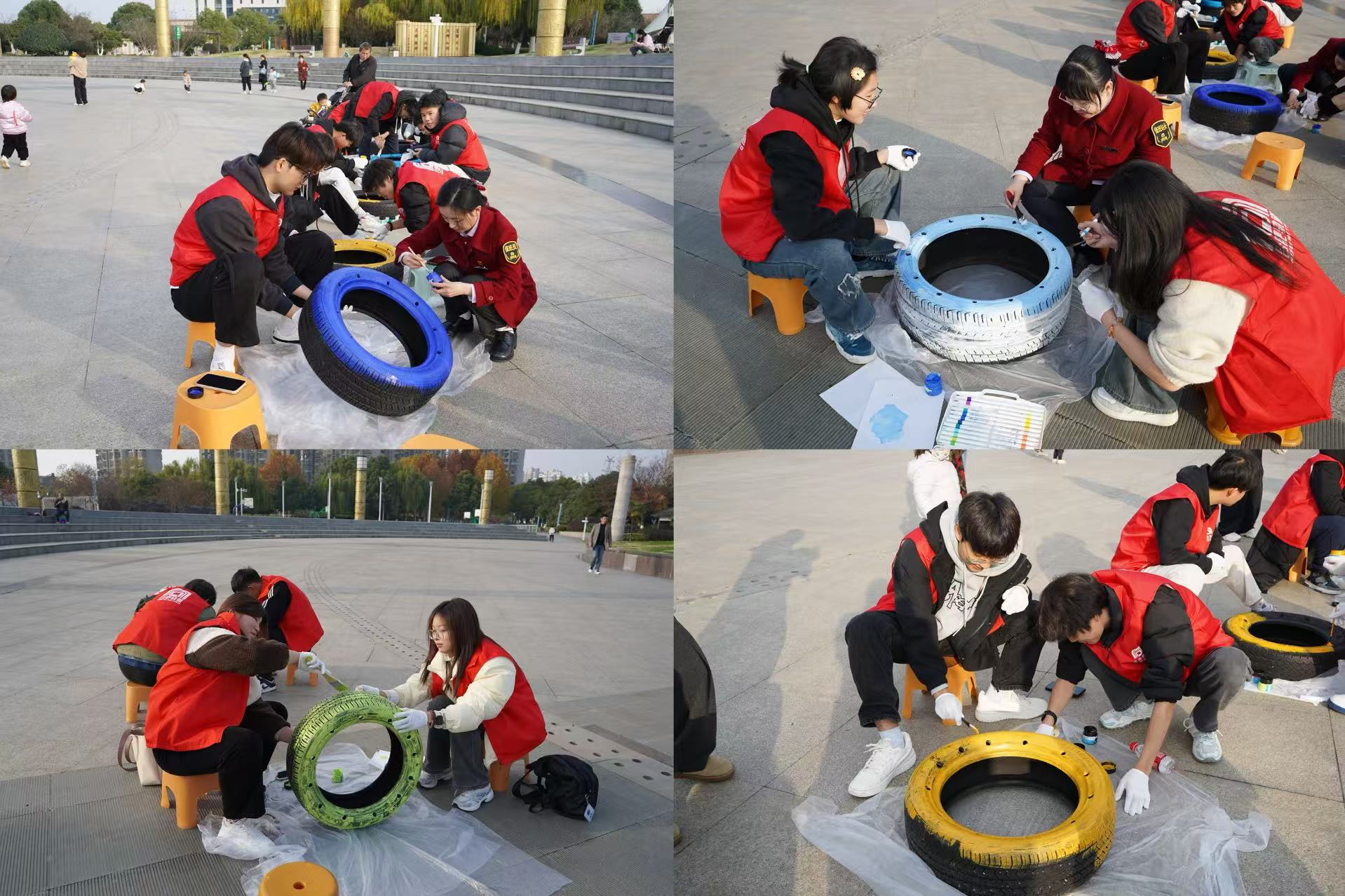 在深入讨论后,同学们迅速行动起来。拿出早已准备好的工具,开始了这场变废为宝的奇妙之旅。同学们或凭借丰富想象与精湛画技,将轮胎画上充满童趣的卡通人物,为地铁站注入活泼气息,或在轮胎上写下美好祝愿,寄寓着对未来的美好期待与向往。公园里散步的人们也纷纷驻足观看,对同学们的作品赞不绝口,“这就是大学生们的朝气与创意,太有意义了,我也要和家里的孩子们一起改造家里废弃的物品,让它们也变废为宝。”