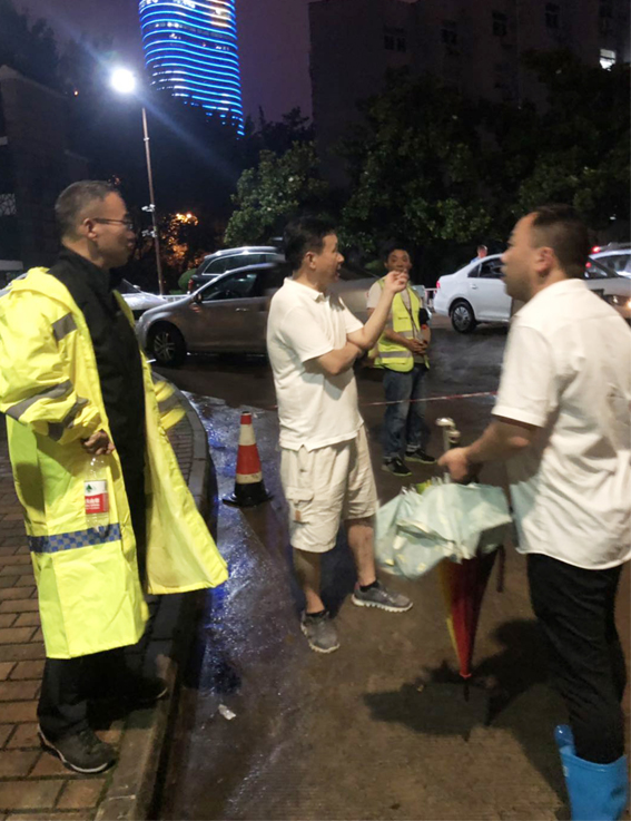 为尽快排除校园积水,物业等部门及时组织工作人员打开地面窨井盖疏通管道,并安排专人站在深水中把守在掀掉的窨井盖旁,确保师生员工安全通行,直至积水消退。