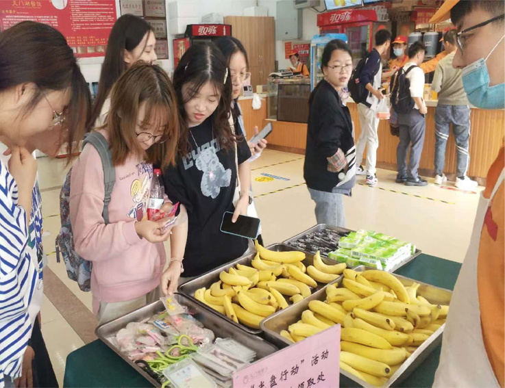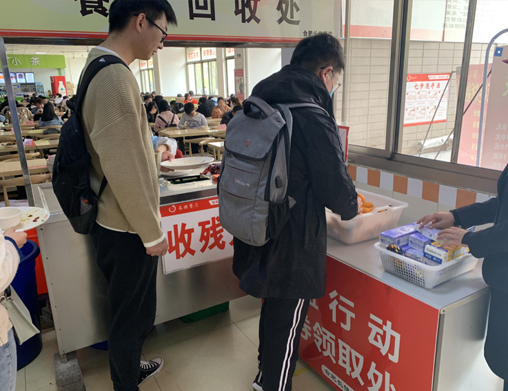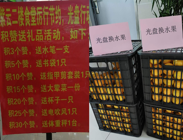 近期,各食堂相继开展“合理取餐、光盘有奖”主题活动,鼓励广大师生厉行勤俭节约,拒绝餐饮浪费。紫云餐厅二楼食堂推出“光盘积赞送礼品”活动,师生可根据积赞数量不同兑换相应礼品;紫云餐厅一楼、南苑餐厅A、B、C、D区食堂先后推出“饭后光盘送小礼品”活动,就餐师生可凭餐后光盘换取水果、文具、卡包、餐巾纸等小礼品。同时,各食堂在收餐处安排专人对就餐完毕餐具回收情况进行监督,对剩余过多的师生给予及时提醒,提示大家按需购餐,减少浪费。