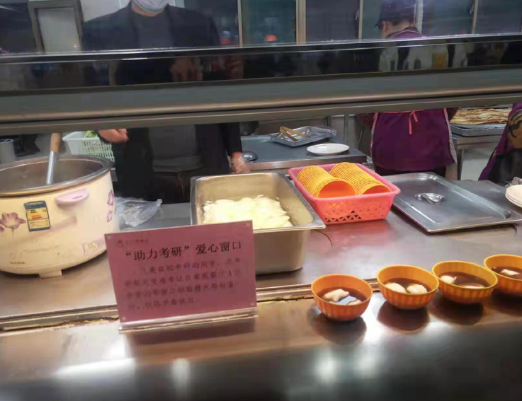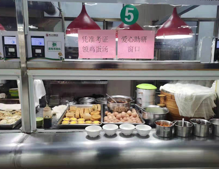 研考期间,每天早餐,一份“红糖荷包蛋汤”暖心暖胃。南北校区各食堂为考生精心准备了爱心能量早餐“红糖荷包蛋汤”,考生同学免费领取。每天早晨6点,各食堂把空调调整到最合适温度,迎接前来就餐的师生。考研同学们坐在一起,喝着热乎乎的“红糖荷包蛋汤”,似乎减轻了一些压力,整个食堂氛围显得愉快温馨。
