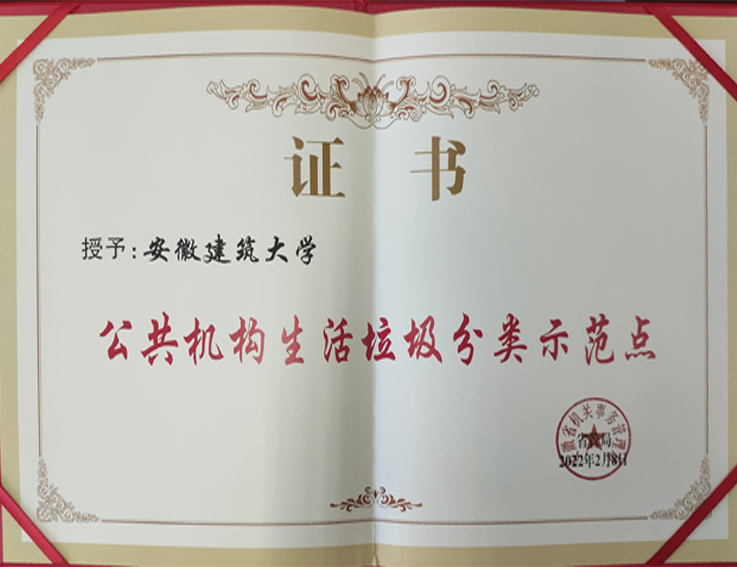 本网讯  2022年,学校被安徽省机关事务管理局授予“公共机构生活垃圾分类示范点”荣誉称号,并颁发证书。