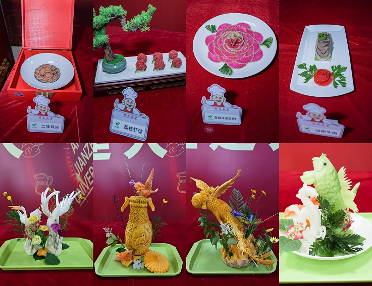 校庆美食节开幕式当天,校园内彩旗飘飘,笑语盈盈,处处洋溢着欢乐的氛围。南苑C区食堂就餐大厅内,现场氛围喜庆热烈,各种美食完美展现,精心准备的美食品种丰富,色香味俱全,观赏区、精品区、小吃区和自助区四个区域内,精美绝伦的雕花,香气扑鼻的热菜,五味俱全的小吃和甜美可口的糕点,让人目不暇接,回味无穷,师生们免费品尝着食堂美食,脸上洋溢着欢乐笑容。