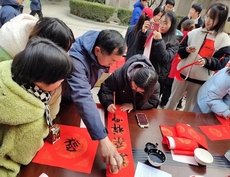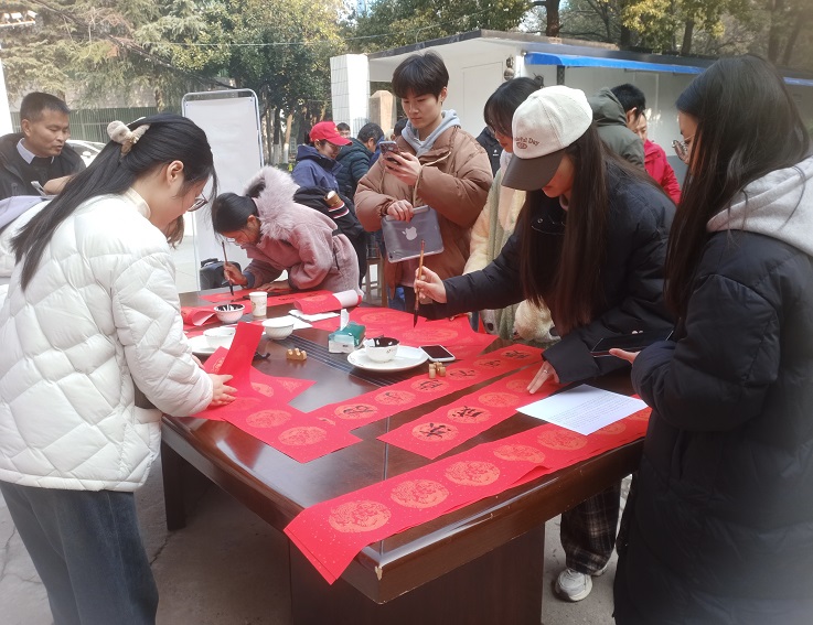 一墨一砚一宣纸,一字一句一名言,书法用自己的方式传承着中华传统文化的独特魅力,北区在活动现场摆上办公桌,准备好笔墨纸砚,同学们在现场挥毫泼墨,写下了一副副春联,毛笔起起落落挥洒出青春的风采,火红的纸张在老师和同学们的字字句句中有了神韵。“龙年吉祥喜事来  建筑大学育人才”、“百鸟啼转万树花 九龙飞舞千秋雪”、“迎新年百福呈祥 辞旧岁家业兴旺”……一句句喜庆吉祥的祝福被写在洒金红纸上,展现出对幸福生活的追求与祝福,也有平安吉祥、和谐发展的美好寓意。