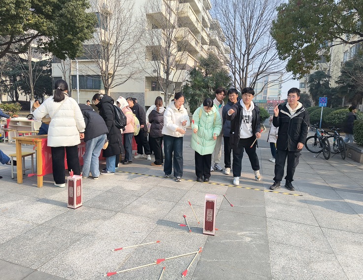 投壶,是我国古代人常玩的一种投掷游戏,也是一种传统礼仪。据有关资料记载,投壶最早起源于射礼,在战国时期较为盛行,尤其是在唐朝,得到了发扬光大,成了平民百姓日常的一种娱乐消遣。通过一定规则,将手中箭矢投入“壶”中,既能锻炼大脑判断能力,还能考验身体协调性和心理素质,在两人角逐的过程中,赛事跌宕起伏,调拨着选手与观众心弦,现场投壶项目吸引了同学们的热情参与和围观,投进一支呼声四起,现场气氛欢乐和谐。