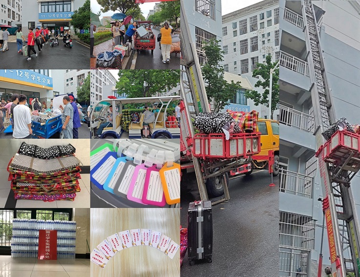 完成一次搬迁,解决实际困难。为改善学生住宿环境,暑期对南校区2栋学生公寓进行全面维修,625启动南校区11#14#楼内居住的1321名学生搬迁工作。为解决学生搬上搬下行李的难题,租赁4台云梯,运行约1000余次,组建志愿服务车队,帮助同学们运送行李。此外,为搬迁学生准备了3000个编织袋、行李标牌,2000瓶矿泉水,4桶绿豆汤,1500张搬迁餐券,全力以赴保障搬迁工作顺利完成
