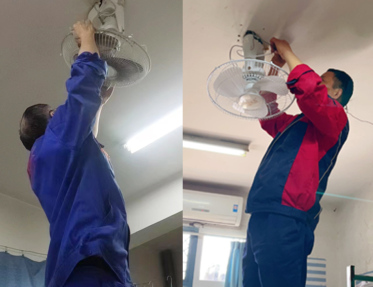 4月21日起,通过学生自查及物业工作人员专项排查,汇总问题并安排逐一维修。针对电风扇存在无法运转、异响、线路异常等问题,师傅们首先是查看风扇调速器,接着便麻利地爬上楼梯、拆下故障风扇、检测线路,然后便是对电容、电机、齿轮等部件的测试,或是损坏无法维修则直接更换,整个动作熟练利索、一气呵成。