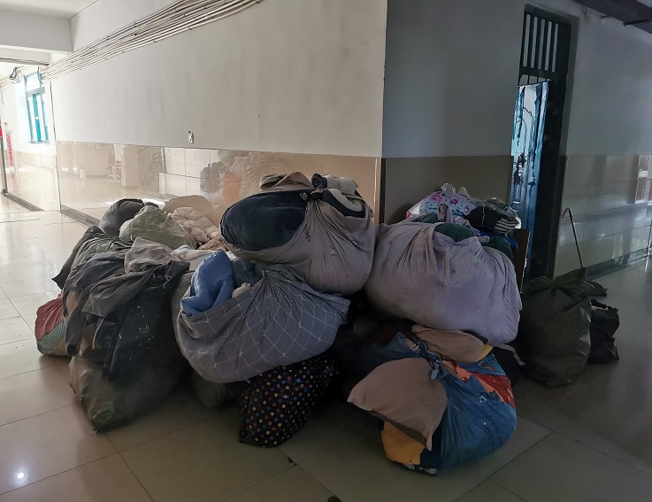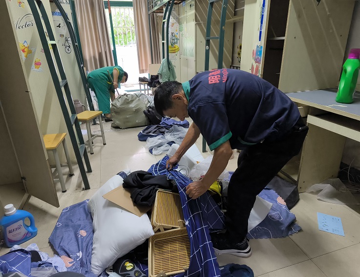 毕业生离校期间,加大对学生公寓卫生保洁力度,及时进行卫生清扫、垃圾清运、巡视监督等,在毕业季垃圾量激增的情况下,增加垃圾清理时间和清运次数,力保垃圾无堆积。