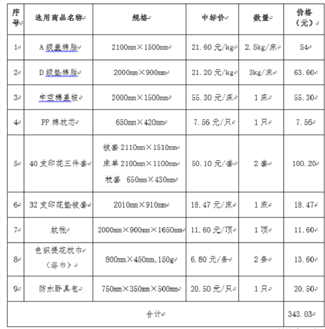 (三)委托采购的学生公寓用品按套售卖,所含商品及价格如下: