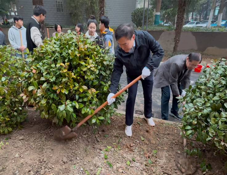 尽管天空飘着细雨,但大家的热情丝毫未减。马文革和黄显怀率先拿起铁锹,与师生们一起挥锹铲土、扶苗填坑、浇水培土,每一道工序都做得认真细致。马文革强调,植树造林是功在当代、利在千秋的事业,希望通过此次活动进一步提高广大师生共建共享生态校园的意识,让绿色成为校园的底色。