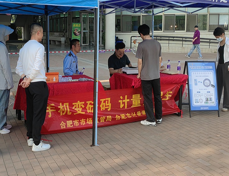 本网讯 为增强师生的计量意识,维护消费者在计量方面的合法权益,4月18日,合肥市市场监督管理局联合合肥市计量测试中心在学校南园餐厅广场前开展“手机变砝码,计量惠民生”公益活动。