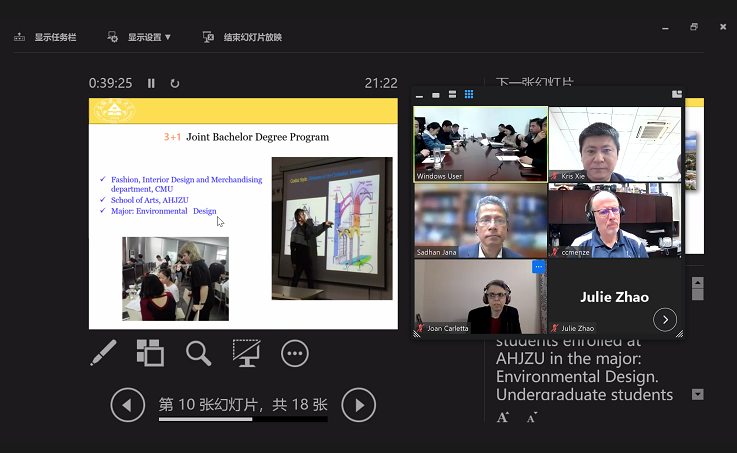 丁湘代表国际处向美方参会人员介绍了我校发展概况、办学特色与优势,以及近年来我校国际交流合作的总体情况,并详细介绍了我校与美国中密根大学开展的31合作办学本科教育项目及与美国加州大学河滨分校开展的31+X学生交流项目,同时对与美国阿克伦大学开展具体合作交流项目提出建议和展望。视频会上,材化学院副院长张峰君教授和环能学院李卫华教授分别代表各自学院介绍了学科发展概况以及在教学、科研、学术交流、人才培养等方面所取得的成绩,并对与美国阿克伦大学就科研合作与交流提出具体想法与建议。