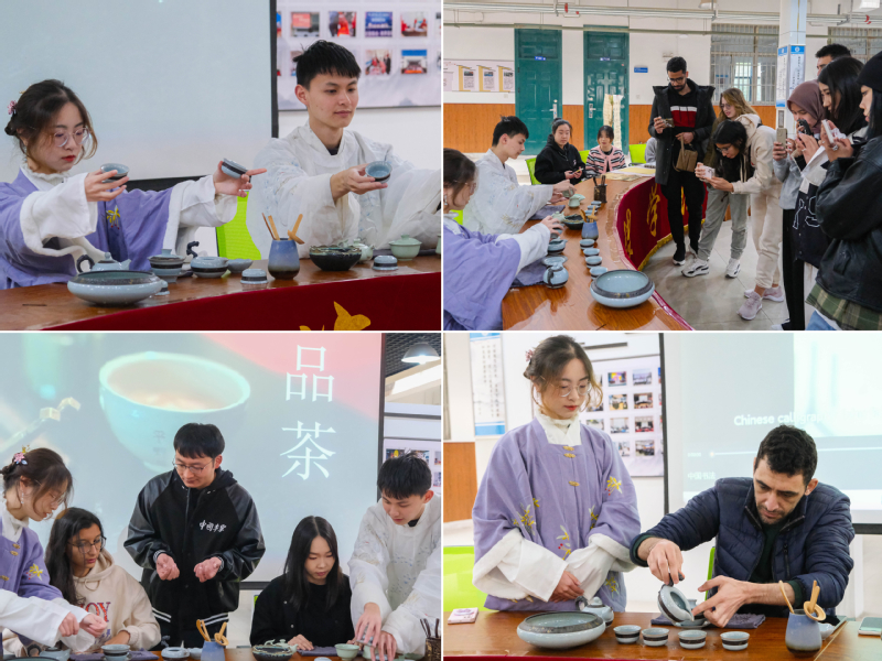 齐品茶香茶韵,乐系友谊之结。谢梦飞老师亲切阐述中国茶道的渊久历史、茶叶品类和茶具常识。国际交流合作处刘珺珺老师与学生共同欣赏小隐茶艺社的茶艺表演,静听冲泡方法和品茗礼仪等。国际学生兴致盎然地品茶,并切身体验冲泡、敬茶的乐趣,中外学生在春光明媚的建大校园奏响一曲高雅又和谐的青春小调。
