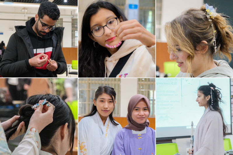 夕闻发簪逸海岸,今见一簪定邦谊。发簪作为古代定情信物,而今公管学院将其作为友好交流的礼物赠与国际学生。朝含国学社成员演示并指导国际学生制作发簪、试穿汉服、发簪盘发,她们衣袂飘飘,沉浸在中国传统文化的魅力之中。蒙古学生说:“汉服是他们见过最完美的衣服,茶很香,书法也很美,我们不虚此行,很开心!”